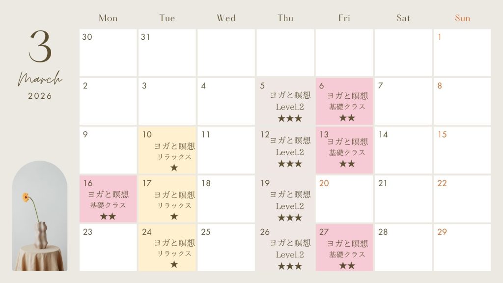 【ヨガと瞑想 (基礎クラス)】隔週1、3月曜日